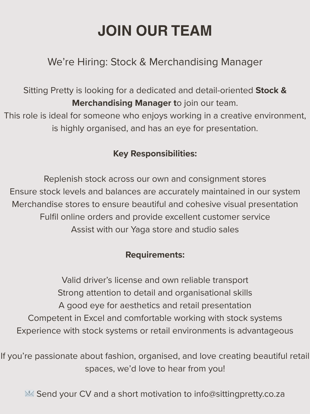 We're always looking for talented individuals, even though we don't have open positions right now. Send your CV to info@sittingpretty.co.za. We'll contact you when opportunities arise. Feel free to reach out for any inquiries!